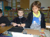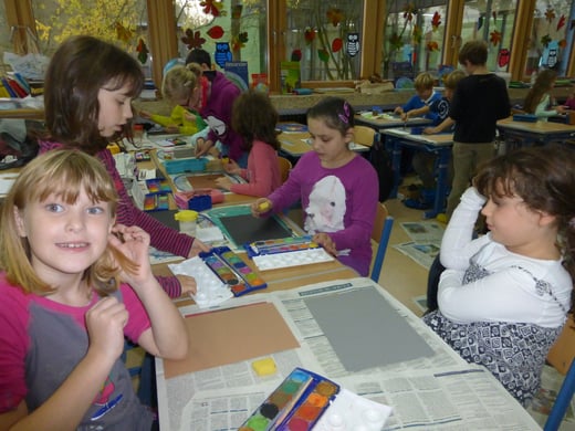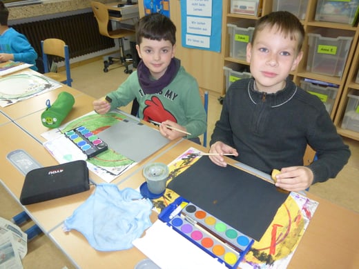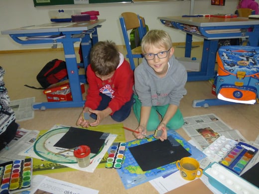 Im Rahmen des Weiterführenden Lesens hatte sich Frau Rauscher eine besondere Überraschung ausgedacht: Im Schein einer Taschenlampe las sie den gebannt lauschenden Jungen und Mädchen die spannenden Gruselgeschichte vom Turmgespenst Flüm, das im Nachttopf wohnt, vor und Frau Ahlmer erzählte von den Erlebnissen des kleinen Gespenstes Lilapumm in der Geisterschule. Anschließend gestalteten die Schulkinder beider Klassen in Partnerarbeit mit Kartoffeldruck-Technik eine Burg, aus deren Fenster ein freundliches Gespenst winkt. Den Schulkindern beider Klassen bereitete dieses gemeinsame Projekt wieder viel Freude, denn miteinander und voneinander Lernen macht allen Spaß - und wenn du wissen möchtest, wo das Turmgespenst ein neues Zuhause gefunden hat und ob Lilapumm in die dritte Gespensterklasse aufsteigen durfte, dann frag doch einmal die Kinder der Klasse 2g und 4g nach diesem spannenden Vorlesebuch!