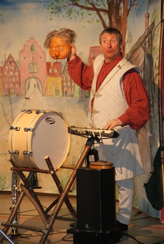 Ein Bauer wurde wegen seiner Kinderlosigkeit verspottet und aus Ärger und Zorn sprach er zu seiner Frau: „Ich will unbedingt ein Kind haben und sollt´s ein Igel sein. Daraufhin bekam seine Frau ein Kind und es war oben ein Igel und unten ein Kind. Der Vater lehnte dieses Halbwesen ab, die Mutter gab ihm den Namen Hans mein Igel. Das arme einsame Kind konnte nur mit den Hühner spielen und auf einem Gockelhahn reiten. Eines Tages wünschte sich Hans mein Igel vom Vater einen Dudelsack. Danach sollte der Vater seinen Gockelhahn in der Schmiede beschlagen lassen, damit er fort reiten konnte. Der Vater gewährte ihm die Bitte, weil er froh war, seinen ungeliebten Sohn loszuwerden. Das Märchen spannte nun einen Bogen über die Erlebnisse des Hans mein Igel, vom Reichwerden bis zur Erlösung als Mann einer gutherzigen Prinzessin. Dabei zog der Darsteller Frieder Kahlert mit seiner Erzählung, die verwoben war mit Maskentheater und musikalischen Darbietungen, die Schüler in seinen Bann. Mit einem langen Applaus bedankten sich Schüler und Lehrer für die märchenhafte Vorstellung.