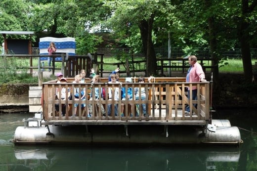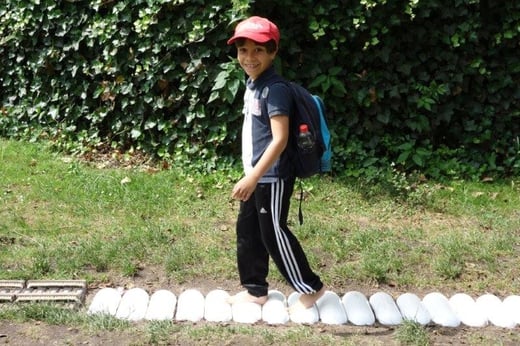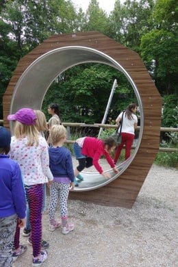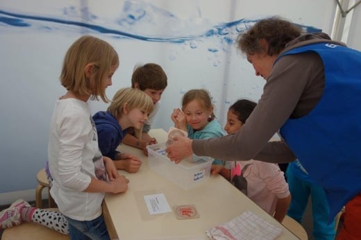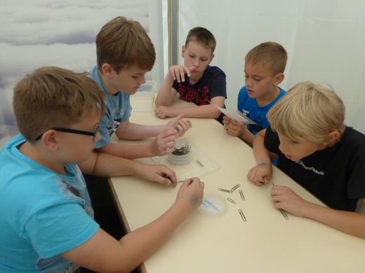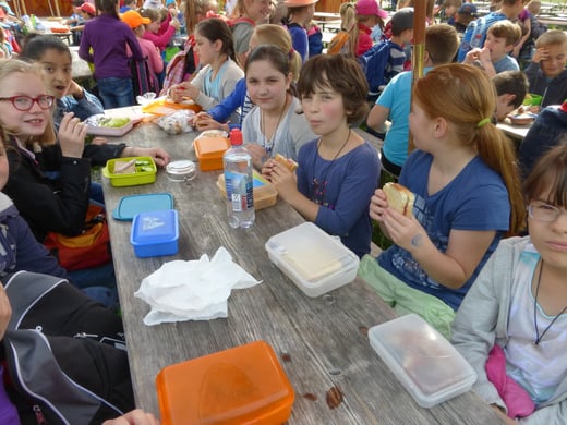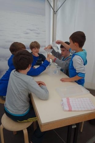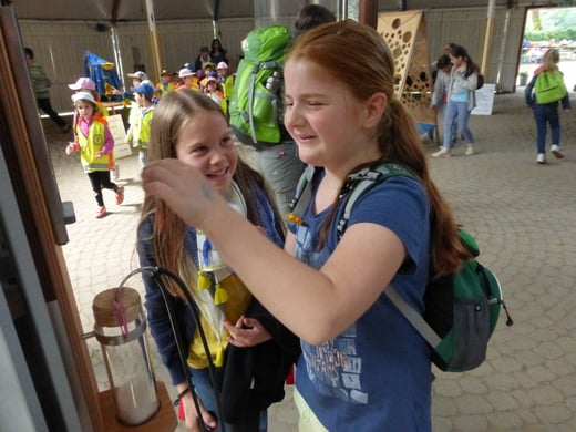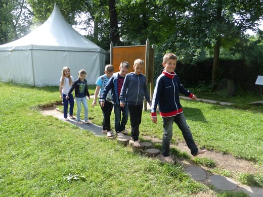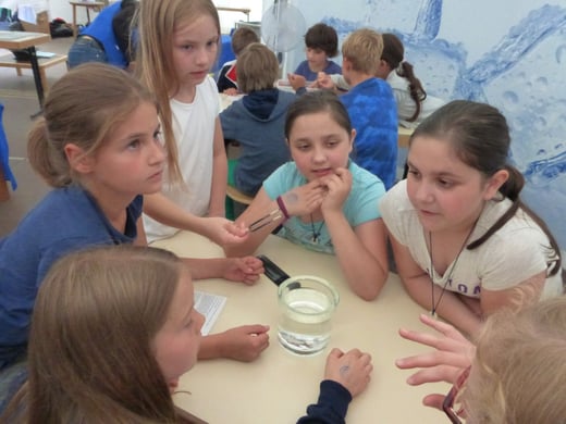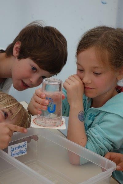 So hatten die Jungen und Mädchen ausgiebig die Möglichkeit an verschiedenen Stationen Wissenswertes rund um das Wasser zu erforschen: Sie ließen beispielsweise im Wasserbecken einen Vulkan aus blauer Tinte ausbrechen, beobachteten die Spannung der Wasseroberfläche, als sie Büroklammern in ein randvolles Glas legten, betrachteten Blütenkelche aus Papier, die sich im Wasser öffneten, verfolgten gebannt die Wasserstrudel, die durch einen eingefärbten Wassertropfen im Wasserbecken entstanden und vieles mehr. Zwischendurch stärkten sich die Schulkinder bei einer ausgiebigen Brotzeit, um anschließend wieder spannende Aktionen mit allen Sinnen zu erleben: Ein Barfuß-Parcours lud zum Mitmachen ein, ebenso versprach der „Dunkelraum“ Spannung für ganz Mutige, Geräusche aus dem Alltag ließen sich gemeinsam erkennen – jeder konnte eine Attraktion finden, die ihn faszinierte. Im Mittelpunkt standen dabei immer die eigene Erfahrung und das eigenhändige Tun. Gemeinsam machten diese Experimente natürlich noch mehr Spaß, so waren sich bei der Rückkehr an der Schule alle einig: „Dieser Ausflug hat uns allen großen Spaß gemacht und wir haben viel Neues gelernt!“