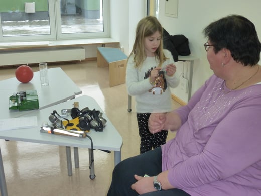 Zunächst erklärte sie in einem interessanten Vortrag, dass es in Deutschland rund 150 000 und in Bayern etwa 14 000 blinde Menschen gibt. Erblinden kann man durch einen Unfall oder durch Krankheiten. Manchmal kommen auch Babys blind zur Welt. Blinde erkennt man an ihrem weißen Stock, an der gelben Armbinde mit drei schwarzen Punkten oder weil sie von einem Blindenhund begleitet werden. Die Ausbildung zum Blindenhund dauert rund 3 ½ Jahre und kostet weit über 20 000 Euro. Besonders gut entwickelt sind bei stark Sehbehinderten der Gehör-, der Tast- und der Geruchssinn. Mit großem Interesse hörten die Schulkinder zu, als ihnen die Blindenschrift, die Louis Braille entwickelt hat, erklärte wurde: Sie besteht aus sechs Grundpunkten, mit denen alle Buchstaben, Satzzeichen und Zahlen gebildet werden können. Diese werden mit den Fingern ertastet. Fasziniert erfuhren die Jungen und Mädchen, wie blinde und sehbehinderte Menschen mit Hilfe zahlreicher Hilfsmittel ihren Alltag erfolgreich meistern: Sprechende Uhren, Gelderkennungsgeräte oder sprachgesteuerte Handys und Computer und vieles mehr bedeuten Unterstützung und Unabhängigkeit bei der Bewältigung täglicher Aufgaben. Außerdem durften die Kinder Brillen testen, die Augenkrankheiten simulierten und sich an Alltagsaufgaben wie z.B. ein Glas Wasser einschenken ausprobieren. Geduldig beantwortete Frau Knappe abschließend alle Fragen und überreichten den Kindern ein Alphabet in Blindenschrift. Sofort machten sich alle Jungen und Mädchen daran, langsam mit den Fingern die einzelnen Zeichen abzutasten, um die jeweiligen Buchstaben auf diese ungewöhnliche Weise zu „erlesen“.