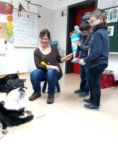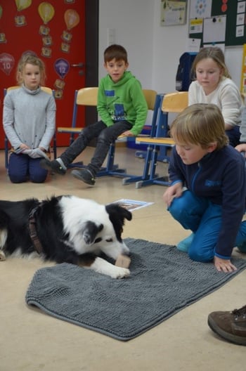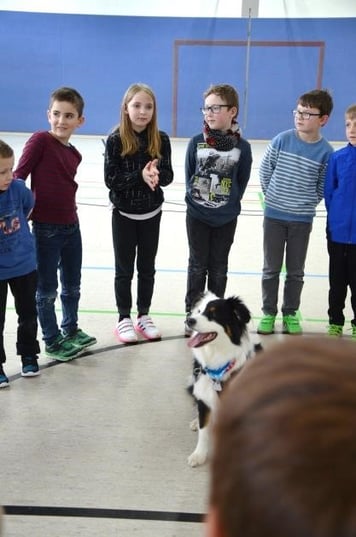 Hochmotiviert bereiteten sich die Kinder auf den Besuch eines Vierbeiners im Klassenzimmer vor: Welche Bedürfnisse hat der Hund? Worauf muss ich achten, damit er sich wohlfühlt? Woran erkenne ich, wie sich ein Hund fühlt und wie gehe ich in verschiedenen Situationen mit ihm um? Diese Fragen standen dabei im Vordergrund, wobei genauso wenig die Vorfahren der Hunde außer Acht gelassen wurden. So befassten sich die Grundschüler mit dem Zusammensein im Wolfsrudel und stellten fest: „Auch wir als Klasse sind – genau wie das Wolfsrudel – zusammen stärker!“ Kurz vor den Weihnachtsferien war es dann endlich so weit. Australian Shepherd „Liah“ kam mit ihrer Besitzerin, Frau Meindl-Kett, zu Besuch. Nachdem Liah sonst des Öfteren im Kindergarten unterwegs ist, war es ihr „erster Schultag“ – und so waren alle mit freudiger Spannung dabei. Es dauerte nicht lange, bis sich die Hündin im Klassenzimmer umgeschaut hatte und beschloss: „Hier fühle ich mich wohl!“ So durften sich alle erst einmal „beschnuppern“, bevor die Grundschüler herausfanden, welch tolle Tricks die dreijährige Vierbeinerin beherrscht. Von „Sitz“ und „Platz“ über „Rolle“ oder „Pfote“ hin zu „Würfeln“ oder „Schlaf“ – spielend leicht führte Liah die Kommandos der Kinder aus, die mächtig stolz darauf waren, mit der „Fellnase“ Kunststückchen vorführen zu dürfen. Ein weiterer Besuch im Januar brachte weitere Freude in die Ganztagesklasse. Liah besuchte die Schülerinnen und Schüler erneut und dieses Mal wurde mit viel Spiel und Spaß ein ganzer Nachmittag miteinander verbracht. Die Zweitklässler versteckten zunächst Leckerlis im Klassenzimmer, um Liahs außerordentlichen Geruchssinn zu beobachten. Später spielte die Hündin ein Kreisspiel mit den Kindern, die sich schließlich einen abwechslungsreichen Parcours ausdachten, den sie gemeinsam mit ihrer neuen, vierbeinigen Freundin durchliefen. Die Kinder waren mit viel Freude dabei und gaben an, viel über den Hund, sich selbst, aber auch die Gemeinschaft gelernt zu haben. Eine Mutter brachte es auf den Punkt: „Ein Nicht-Lern-Projekt – und dennoch lernen die Kinder etwas!“ Die Kinder haben eine neue Klassenkameradin und Freundin für sich gefunden. Sie sind sich einig, dass Liah am besten jeden Tag in die Schule kommen soll: „Liah ist einfach toll, kuschelig und süß! Wir freuen uns, wenn sie uns bald wieder besuchen kommt!“