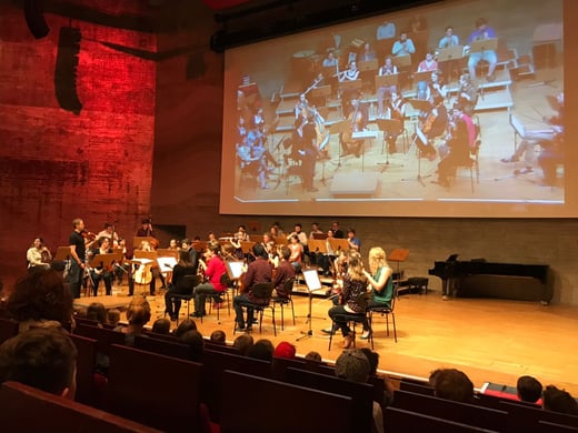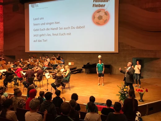 Die Idee war es, die Kinder, die sich ja häufig für Fußball begeistern, auf unkonventionelle Art mit klassischer Musik bekannt zu machen. So lief gleich zu Beginn der Veranstaltung eine fröhliche Laola-Welle durch das Audimax und stimmte die Kinder auf das Konzert ein. Die Aufgabe des Dirigenten wurde den Kindern auf anschauliche Weise ebenso erklärt, wie die Zusammensetzung eines Orchesters und deren Instrumente. Ausschnitte aus den musikalischen Werken von vier Komponisten luden zum Zuhören, Staunen und Mitmachen ein: Anhand von Anschauungsmaterialien bestens vorbereitet, sangen die Kinder eigens eingeübte Texte oder vollführten eine mitreißende Body Percussion, in denen die Fußball-Thematik wieder aufgegriffen wurde. Ein besonderes Highlight stellte auch der Auftritt von Samuel Weller, einem Freestyle Ballkünstler dar, der seine unglaublichen Kunststücke mit einem Fußball zur musikalischen Darbietung zeigte und die Kinder natürlich tief beeindruckte. Ein gelungenes Projekt, das alle Zuhörer begeisterte!