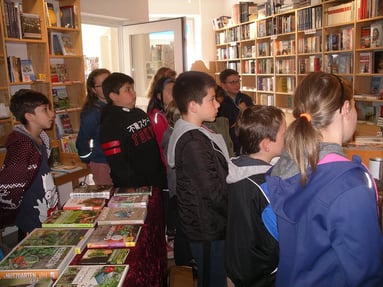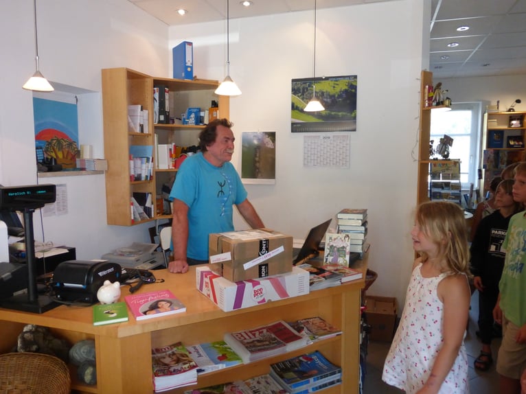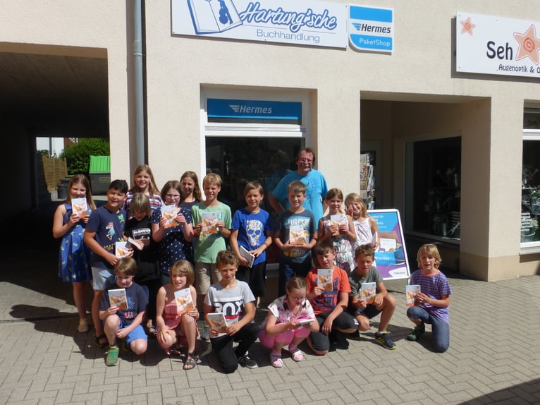 So lud auch Herr Hartung vergangene Woche wieder alle Kinder der 4. Jahrgangsstufen herzlich in seinen Buchladen ein, um sich ihre Bücher zur Aktion „Ich schenke dir eine Geschichte“ abzuholen. Bereits der Titel: „Der geheime Kontinent“ verspricht Spannung und Abenteuer: Tim und Meike verbringen mit ihrer Klasse einen Schullandheimaufenthalt in einer alten Burg. In der staubigen Bibliothek stoßen die Kinder dort auf eine mysteriöse Tür, die angeblich zu einem geheimen Kontinent führt, in eine Welt in der es Einhörner, Zwerge und Elfen gibt, deren fantastischer Lebensraum jedoch von einem Drachen bedroht wird. Tim und Meike müssen nun allen Mut aufbringen, um sich gemeinsam der gefährlichen Kreatur zu stellen … Mehr werden wir hier jedoch nicht verraten, damit sich jeder von euch selbst in das aufregende Leseabenteuer stürzen kann! Unterhaltsam berichtete Herr Hartung von den vielfältigen Aufgabenbereichen eines Buchhändlers und lud anschließend die begeisterten Kinder ein, in seinem Laden die vielfältige Bücherauswahl zu erkunden und in den ausgestellten Exemplaren zu schmökern. Abschließend waren sich die Kinder einig: E-books sind zwar eine moderne Alternative, aber ein echtes Buch in Händen zu halten, darin zu blättern und zu lesen, macht doch am meisten Spaß!