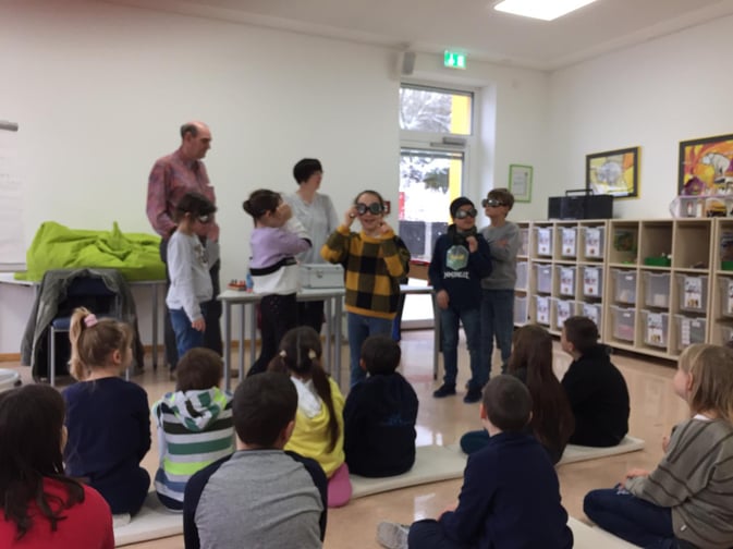 Manchmal kommen auch Babys blind zur Welt. Blinde erkennt man an ihrem weißen Stock, an der gelben Armbinde mit drei schwarzen Punkten oder weil sie von einem Blindenhund begleitet werden. Die Ausbildung zum Blindenhund dauert rund 3 ½ Jahre und kostet über 25 000 Euro. Besonders gut entwickelt sind bei stark Sehbehinderten der Gehör-, der Tast- und der Geruchssinn. Mit großem Interesse hörten die Schulkinder zu, als ihnen die Blindenschrift, die Louis Braille entwickelt hat, erklärte wurde: Sie besteht aus sechs Grundpunkten, mit denen alle Buchstaben, Satzzeichen und Zahlen gebildet werden können. Diese werden mit den Fingern ertastet. Fasziniert erfuhren die Jungen und Mädchen, wie blinde und sehbehinderte Menschen mit Hilfe zahlreicher Hilfsmittel ihren Alltag erfolgreich meistern: Sprechende Uhren, Farberkennungsgeräte oder sprachgesteuerte Handys und Computer und vieles mehr bedeuten Unterstützung und Unabhängigkeit bei der Bewältigung täglicher Aufgaben. Außerdem durften die Kinder Brillen testen, die Augenkrankheiten simulierten und sich an Alltagsaufgaben, wie beispielsweise ein Glas Wasser einschenken, testen. Geduldig beantworteten Frau Knappe und Frau Pichlmeier abschließend alle Fragen und überreichten den Kindern ein Alphabet in Blindenschrift. Sofort machten sich alle Jungen und Mädchen daran, langsam mit den Fingern die einzelnen Zeichen abzutasten, um die jeweiligen Buchstaben auf diese ungewöhnliche Weise zu „erlesen“.