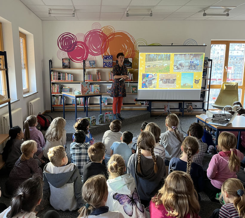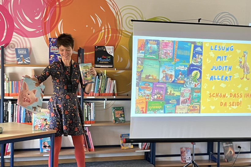 Die Kinderbuchautorin stellte den Kindern einige ihrer Bücher in Auszügen vor und zog dabei mit lustigen und spannenden Geschichten alle Kinder in ihren Bann. Außerdem ermöglichte Frau Allert einen Einblick in ihre Arbeit als Kinderbuchautorin und zeigte anhand von Fotos und Erzählungen wie ihre Bücher entstehen und woher sie ihre Ideen nimmt. Neugierig geworden? Viele Bücher von Judith Allert können in unserer Marktbücherei ausgeliehen werden.